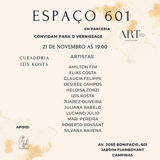 Com curadoria de Izis Kosta, que é também artista, a abertura está agendada para ocorrer na próxima terça-feira, 21 de novembro a partir das 19h à Avenida José Bonifácio, 601 – Jardim Flamboyant, Campinas, endereço do Espaço 601.