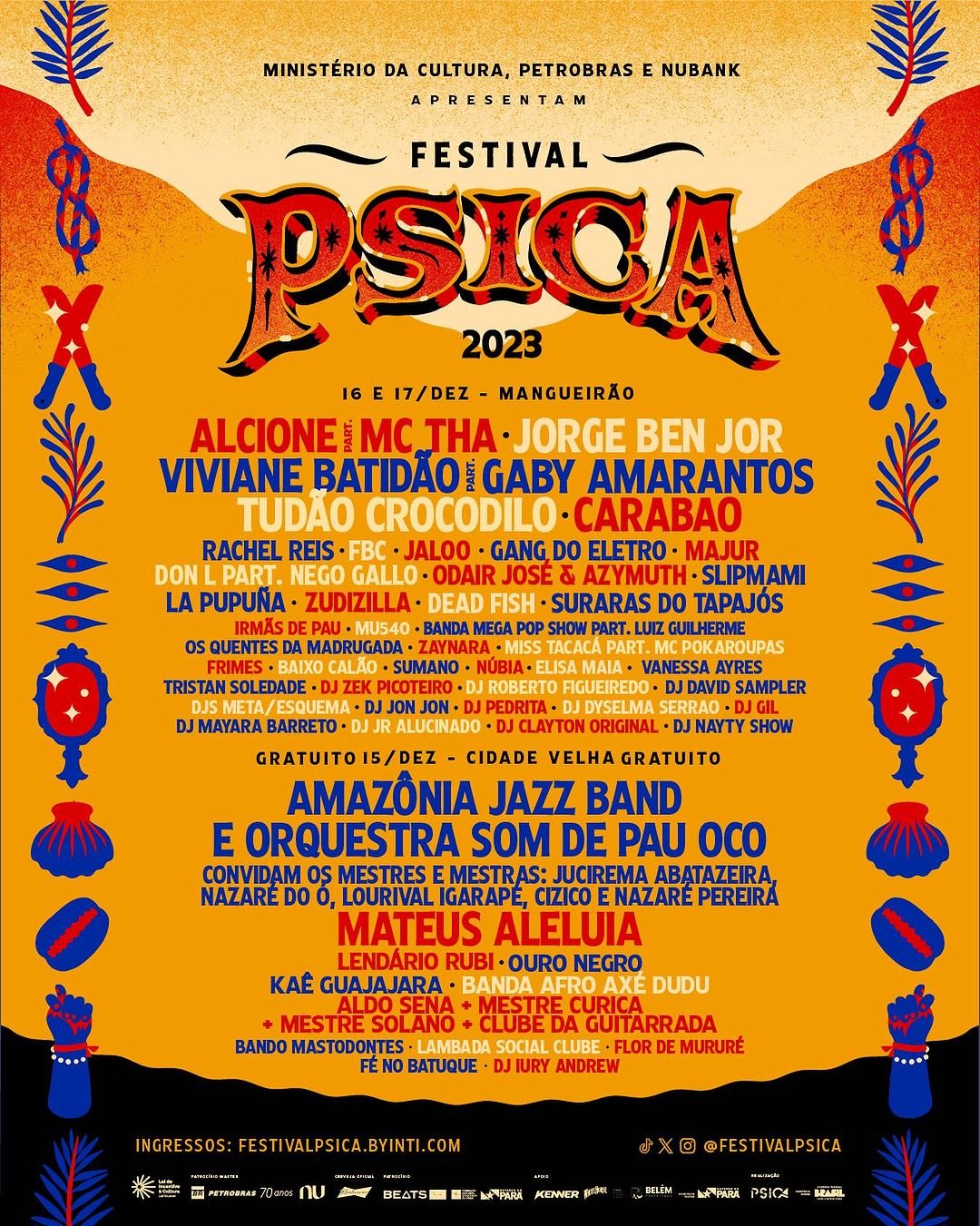 Colocando Belém do Pará na rota dos festivais independentes do Brasil, a 11ª edição do Psica acontece de 15 a 17 de dezembro, com o primeiro dia gratuito na Cidade Velha e outros dois com ingressos – ainda estão disponíveis em festivalpsica.byinti.com – no Mangueirão. Grandes nomes da música brasileira e representantes da cultura preta são destaques na programação, como Jorge Ben Jor e Alcione, que fará show inédito com participação de MC Tha. A identidade regional, explorando a periferia preta da Amazônia, também são marcas do evento que traz diversos mestres da cultura paraense e grandes aparelhagens de tecnobrega.