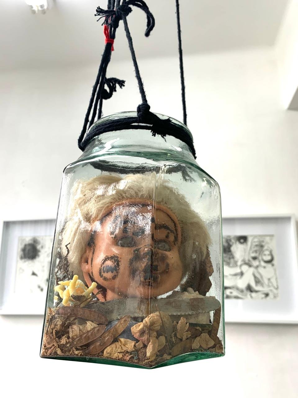 A artista instala estas perguntas espacializando um percurso que se pretende como uma rede de imagens a ser atravessada, cada participante como “coautor”, cada um deles com um fio na mão. Desenhos em nanquim sobre papel e pano, instalação de objetos vidráceos utilizando bonecas antigas e painéis de pinturas-poemas, interligados por uma grande trama de fios, o “fiolado”, formam um percurso pelo feminino, enquanto invenção imposta culturalmente.