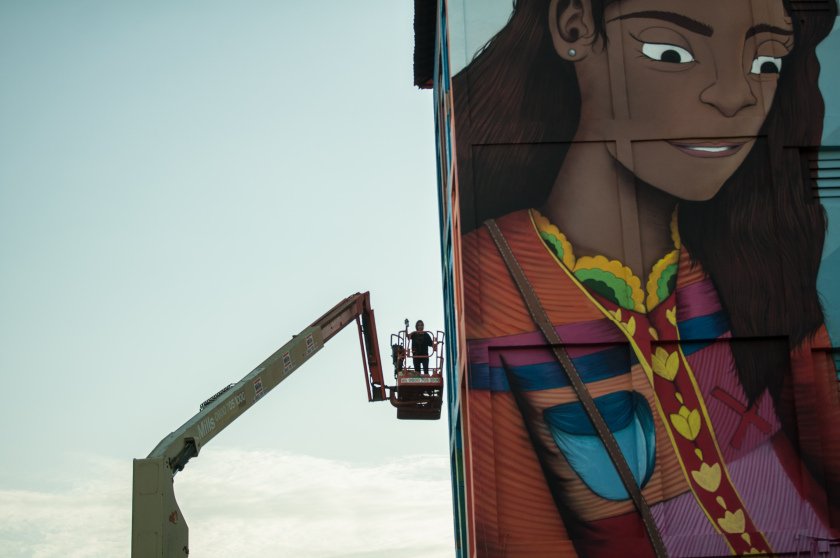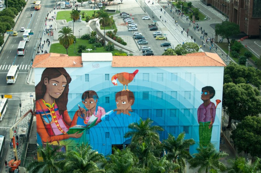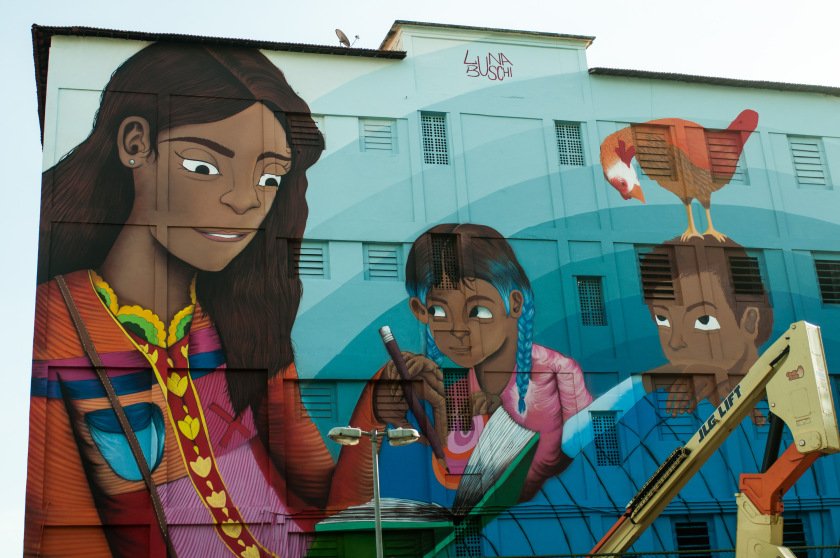 Com apenas dezenove anos e sem experiência formal no mundo das artes, a carioca Luna Buschinelli produziu ‘o maior grafite do mundo realizado por uma mulher’. A obra, o enorme painel intitulado “Contos”, foi feita no prédio da Escola Municipal Rivadávia Corrêa na famosa Av. Presidente Vargas, uma das principais avenidas do Rio de Janeiro, que cruza o centro do Porto Maravilha à Prefeitura do Rio.
