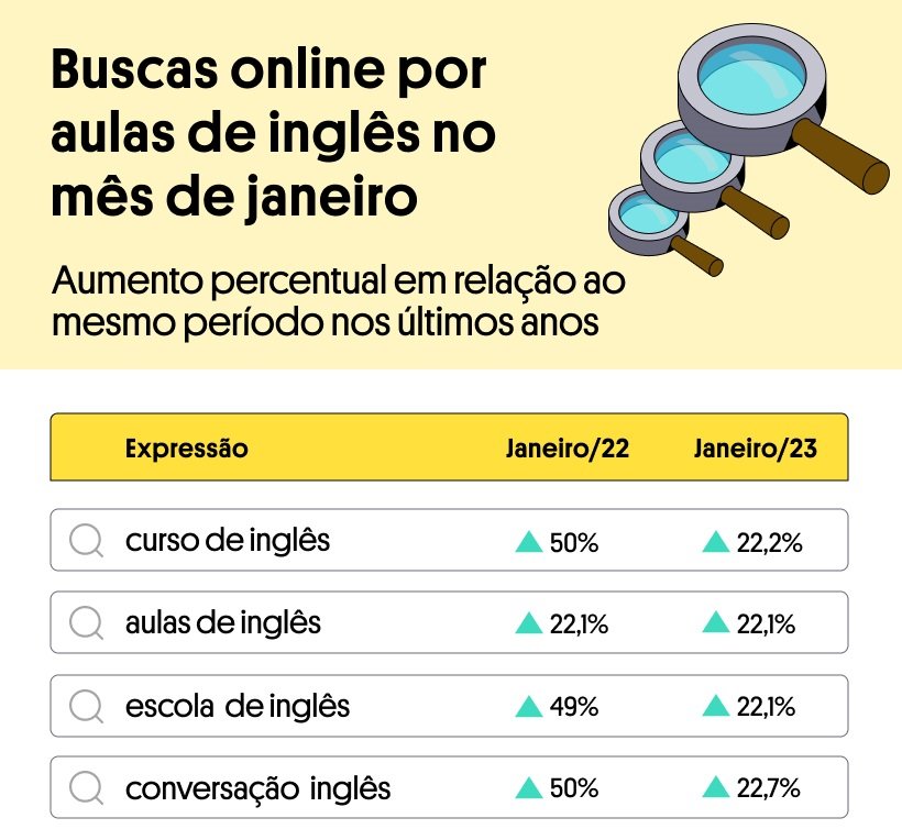 Prova disso é o fato de que, se comparadas a janeiro do último ano, expressões como “curso de inglês”, “escola de inglês” e, ainda, “conversação inglês” renderam 22% mais pesquisas de Norte a Sul no começo de 2024, com destaque ainda mais considerável quando em comparação com 2022 — nesse caso, as buscas online mais recentes pelos termos em questão representam o crescimento de 50%.