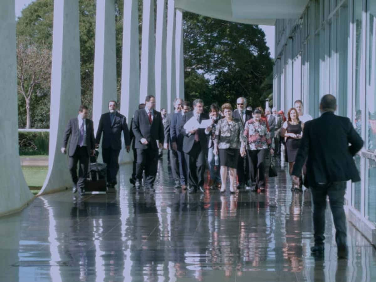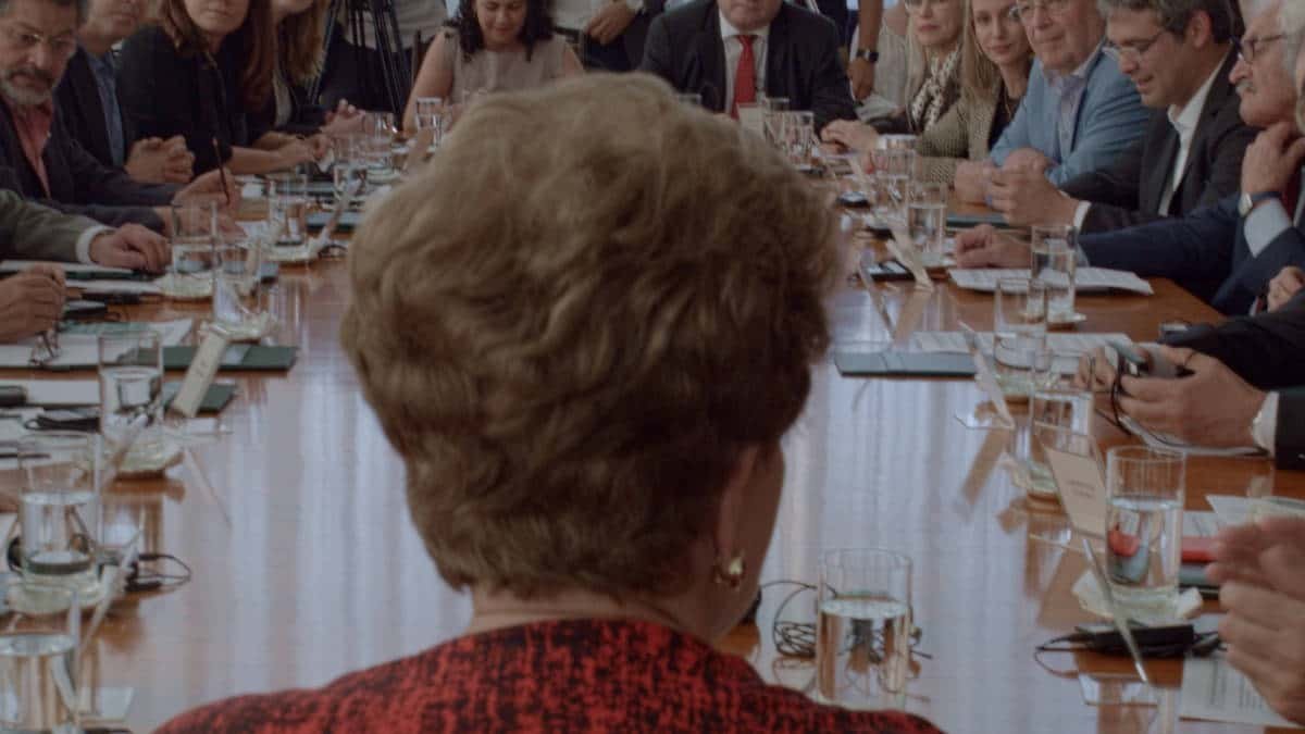 A resignação de Dilma diante da urgência dos bastidores para sua destituição, mostrada na intimidade possível de uma câmera apontada para si, é o que mais fala sobre o documentário. Tem-se ali um indivíduo em perspectiva pelas instituições que o forjaram. Não é um filme sobre o impeachment em si, mas sobre ela e o ambiente em que se inseria no momento da hoje entendida, conspiração.