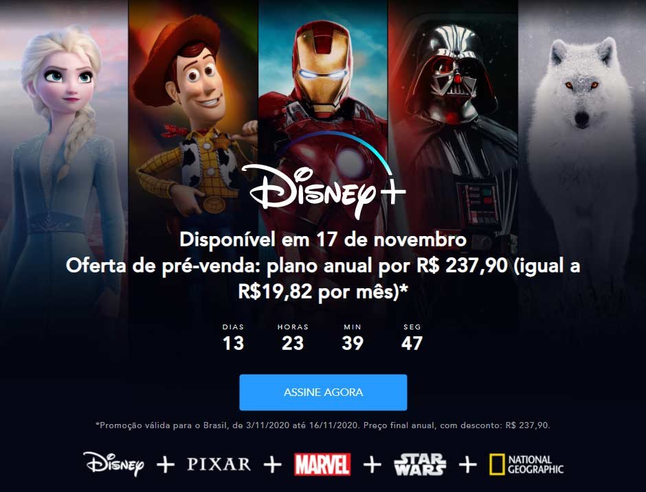 Quem assinar o Disney+ entre 3 e 16 de novembro poderão adquirir a mensalidade do primeiro ano por RS$ 237,90, o que significa o valor de a R$ 19,82 por mês.