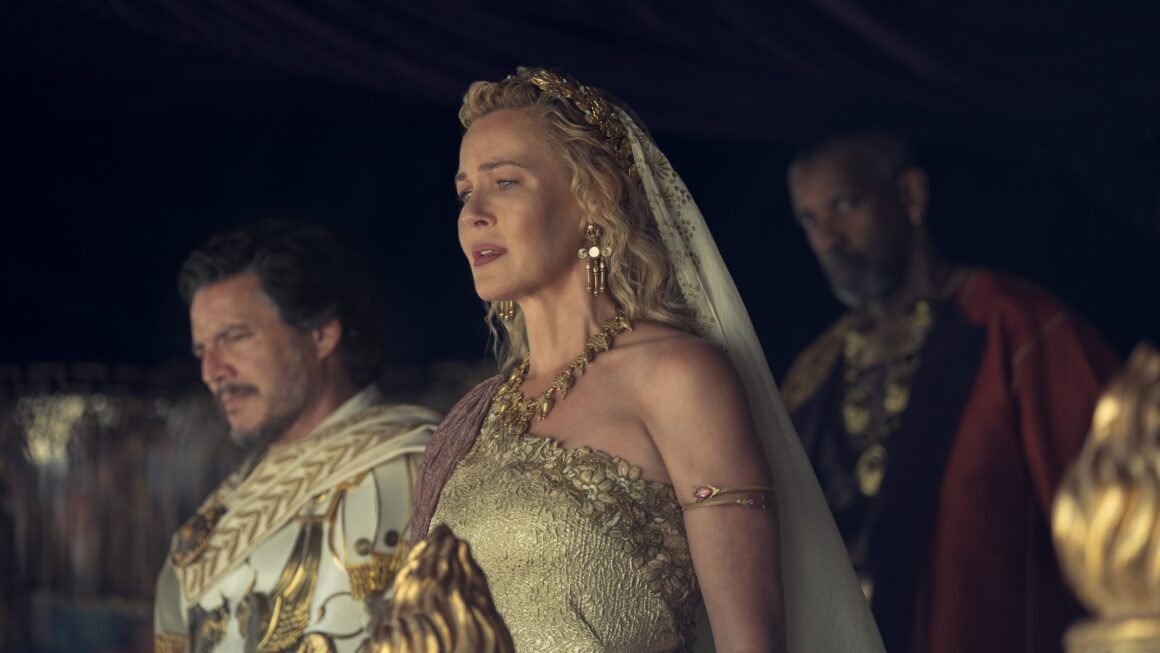 Paul Mescal se sai bem como novo protagonista, mesmo sem a robustez do antecessor. Ele consegue ser convincente no lado mais dramático, ainda que pareça ir se diluindo ao longo da trama. Pedro Pascal defende seu personagem com a tradicional competência e forma um ótimo par com Connie Nielsen, que ganha ainda mais relevância como Lucilla. Denzel Washington é o grande destaque, assim como fora Oliver Reed no longa anterior, inclusive exercendo a mesma função. Ainda que com um arco que se revela simplista no fim, o ator proporciona uma atuação pomposa sendo o dono do show toda vez que entra em cena.