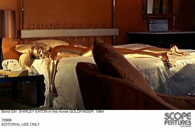 No filme inspirador da cena, a atriz Shirley Eaton é morta pelo vilão Goldfinger após trair ele e dormir com Bond, interpretado pelo ator Sean Connery. A cena clássica é essa abaixo.