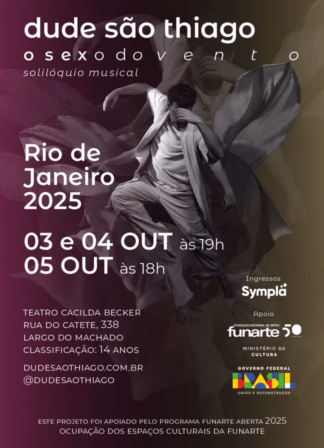 Cantor e ator, Dude São Thiago acaba de lançar seu álbum de estreia, “O Sexo do Vento”, fruto do espetáculo homônimo estreado em São Paulo em 2023. Nele, apresenta uma mescla de releituras de canções consagradas da música brasileira e textos inéditos escritos por Dude. Concebido como um livro de canções, convida o público a uma experiência diferenciada dos tempos atuais, onde música e poética se entrelaçam de forma orgânica. Para celebrar o disco, já disponível em todas as plataformas digitais, Dude reestreia o espetáculo que realizou sua segunda temporada de sucesso em São Paulo, passou por Belo Horizonte, e agora chega ao Rio de Janeiro, nos dias 03, 04 e 05 de outubro, sexta e sábado, às 19h, e domingo, às 18h, no Teatro Cacilda Becker, no Catete.