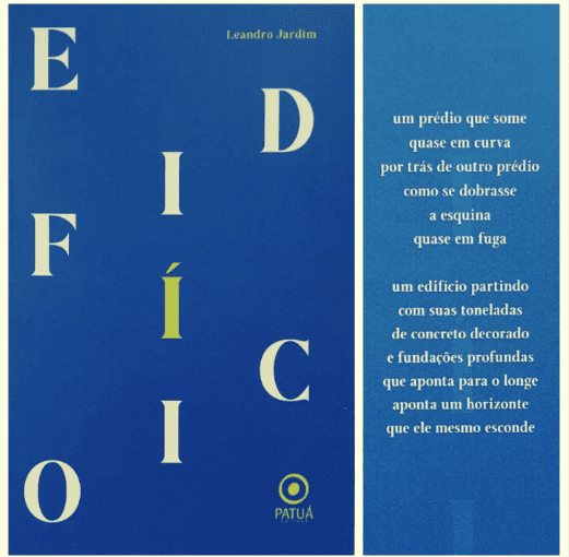 Os poemas de Leandro Jardim trazem em sua construção uma leve referência à poesia concreta – sem trocadilho – já mostrada a partir do projeto gráfico da própria capa da obra, onde as letras da palavra Edifício estão fixadas na página de maneira isolada. Elas apenas estão unidas e sustentadas pela letra “í”, da sílaba tônica, grifada em verde sobre a capa de cor azul, enquanto as demais letras seguem na cor branca.