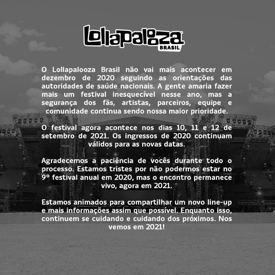 O que já era esperado foi divulgado oficialmente: o cancelamento da edição 2020 do Lollapalooza Brasil.