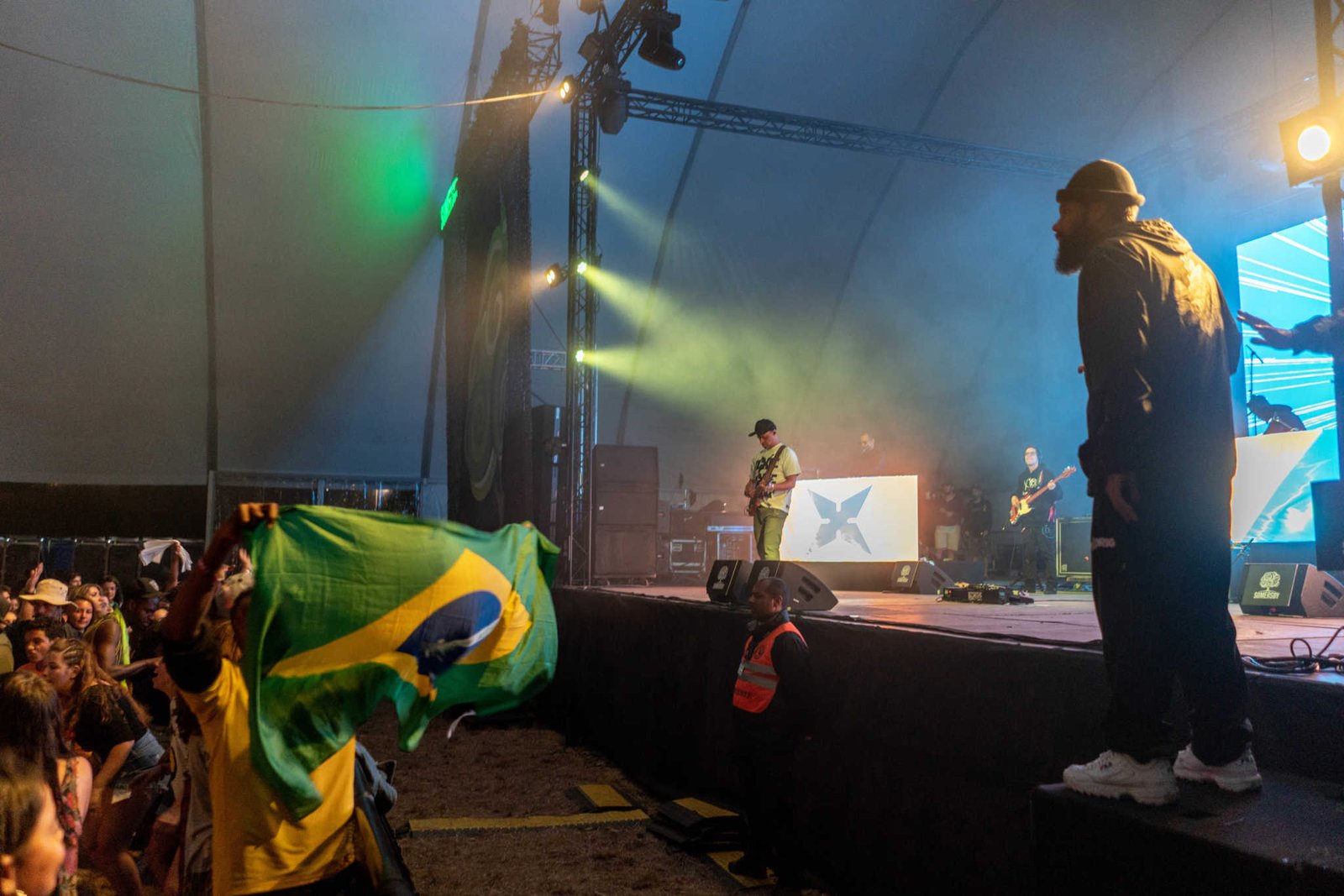 Escondidos no Palco Somersby, com uma modesta e tímida platéia, por volta de meia noite, foi a vez dos brasileiros do BaianaSystem se apresentarem. Aos pouquinhos, a batida pesada dos nossos talentosos baianos foi transformando a área em um local de troca comunitária, dança quase ritualística e estados de transe hipnótico.