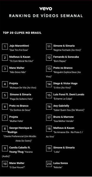 Saiu a lista dos 20 videoclipes nacionais mais visualizados na internet. A gravadora Universal Music domina, com 15 artistas no ranking. A primeira posição ficou com Jojo Todynho, com o clipe de “Que Tiro Foi Esse”, com mais de 157 milhões de views na plataforma, logo seguida da dupla Matheus & Kauan, com o clipe de “Tô com Moral no Céu”, (47.5 milhões de visualizações).
