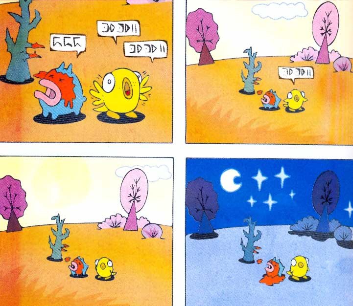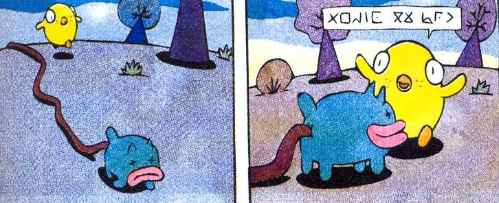 A arte bastante colorida e quase infantil contrasta com a violência, humor negro e escatologia presentes em quase todas as páginas.