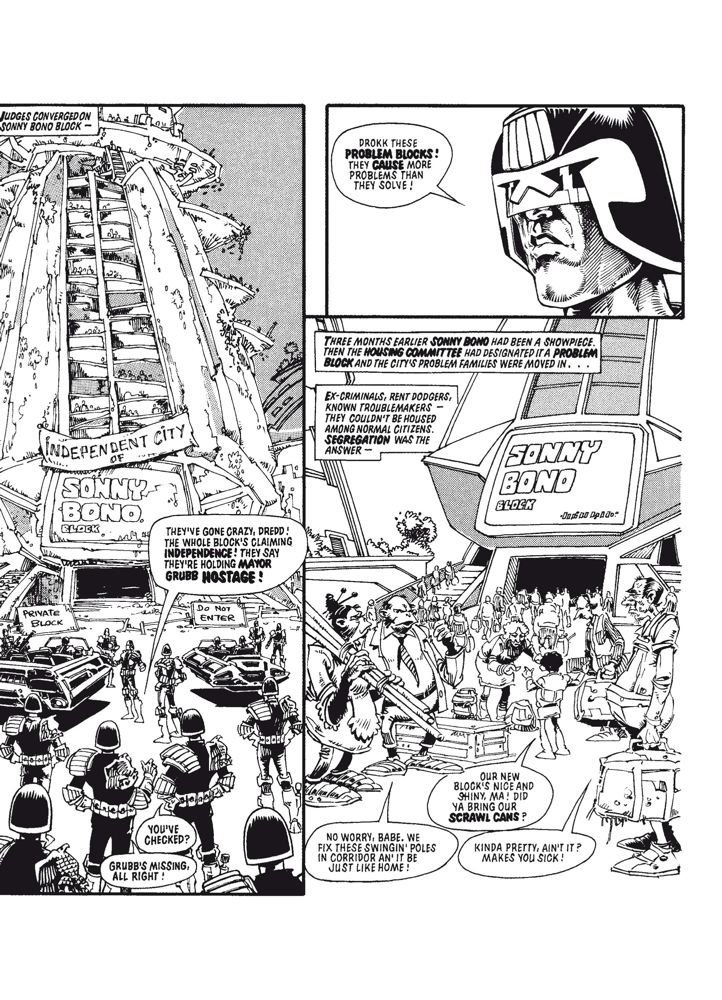 A coleção traz os arcos The Mega-Rackets, Judge Death Lives!, Diary of a Mad Citizen, The Hotdog Run, The Apocalypse War e Black Mania. Os roteiros são assinados por Alan Grant (Batman) e John Wagner (A History of Violence) e arte de Brian Bolland (Batman: A Piada Mortal), Carlos Ezquerra (Preacher), Ron Smith (Transformers) e Steve Dillon (Preacher), Ian Gibson (Halo Jones), Colin Wilson (Blueberry) e Mick McMahon (The Last American).