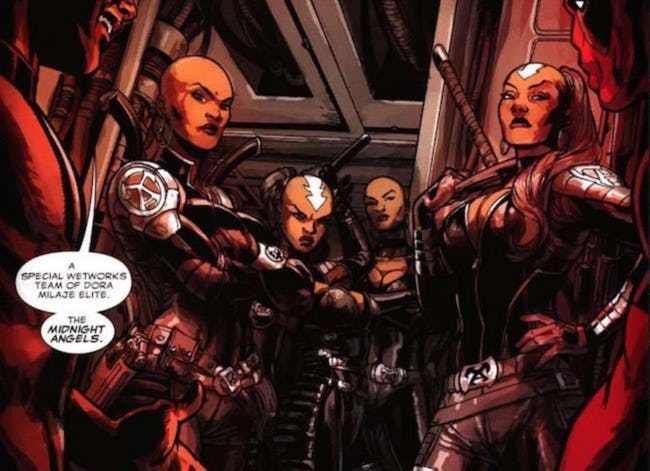 T’Challa tem como guarda real um time de guerreiras invencíveis, as Dora Milaje (ou As Adoradas). São mulheres que usam suas cabeças raspadas, possuem incríveis habilidades em artes marciais e são selecionadas em diferentes setores políticos de Wakanda. Apareceram pela primeira vez em Black Panther Vol. 3 #1, em 1998. Ganharam popularidade entre os leitores e houve até um supergrupo formado por elas liderado por T’Challa, The Mighty Angels.