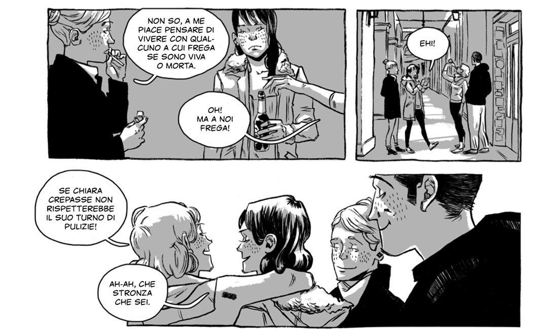 Embora eu não seja especialista em arte sequencial, posso afirmar que o estilo gráfico de Flavia Biondi impressiona pela consistência e personalidade. Seu traço limpo e detalhado combina harmoniosamente com a abordagem realista da história. As cenas cotidianas ganham vida através de composições cuidadosas, enquanto momentos mais introspectivos ou oníricos (como trechos extraídos do livro fictício de Manuel) recebem tratamento mais livre e experimental. Essa dualidade reforça a dicotomia entre a vida mundana dos personagens e suas aspirações idealizadas.
