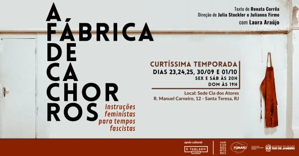 A equipe de “A Fábrica de Cachorros” é composta em sua maioria por mulheres e o espetáculo está sendo financiado coletivamente. Entre as recompensas, oferecem aulas com Marília Moscovitch, cientista e analista política brasileira radicada em Berlim, e com Ana Rüsche, poeta e romancista premiada. LINK: