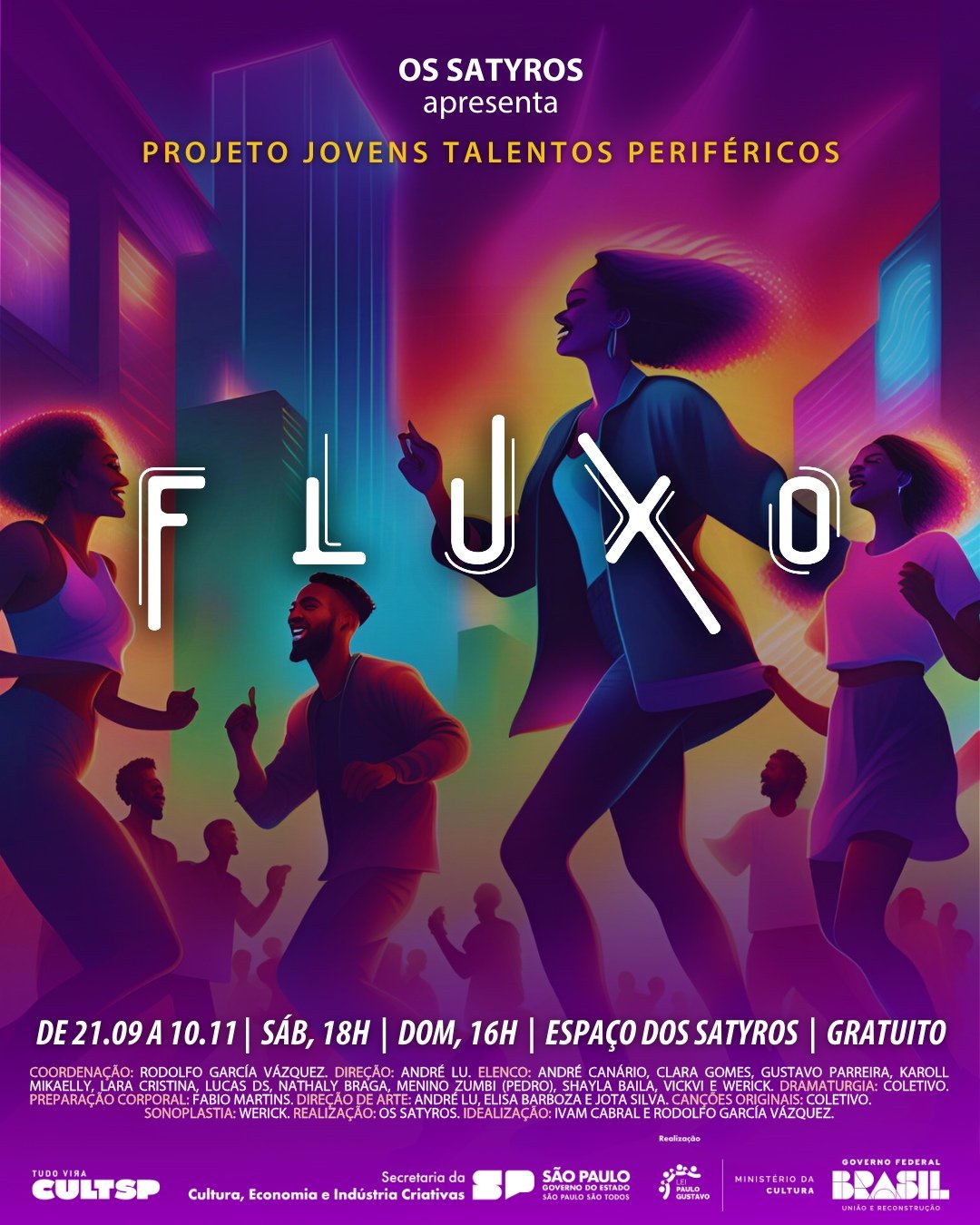 A montagem é o resultado de um extenso processo criativo realizado pelo grupo Os Satyros, que, desde 2011, se dedica a projetos culturais com jovens de zonas vulneráveis de São Paulo. FLUXO foi criado por um elenco talentoso de jovens artistas, selecionados entre mais de 150 candidatos, que, ao longo de três meses de imersão, debateram, improvisaram e deram vida a uma dramaturgia coletiva que reflete suas próprias vivências. Sob a direção de André Lu, a peça apresenta canções originais criadas pelo próprio elenco. A coordenação do projeto é de Rodolfo García Vázquez, um dos fundadores do grupo Os Satyros, conhecido por seu trabalho inovador e comprometido com a inclusão social.
