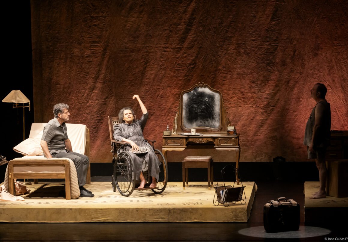 A velha mala de couro – com os segredos e as memórias de uma história de vida – foi o objeto que inspirou e norteou a cenografia de Marcio Medina. Para reproduzir o passado de duas gerações – o quarto de Esther (Noemi Marinho) e do seu filho Franz (Fábio Herford) – o cenógrafo concebeu dois quadrantes espelhados com objetos e mobiliário. O fundo do palco abriga um grande telão de papel – como uma antiga carta -, emoldurado com palavras e fragmentos de frases em hebraico, chinês etc. Medina explica que as peças retratam o que resta de memória no cérebro e alma de Esther e servem de superfície para inúmeras projeções de lembranças e fatos passados. “Os quadrantes pouco a pouco deslizam para as coxias, deixando o palco nu, deserto. Como o apagamento da mente, fica o nada absoluto. Várias malas ocupam todo o espaço aéreo do palco. “Iluminadas, revelam em seu conteúdo imagens de vários grupos perseguidos pelos nazistas na segunda guerra”, explica. “Uma mala pode transportar uma história de sobrevivência, resguardada e reduzida por um apagamento de memória da personagem Esther, de 92 anos. São histórias, objetos e documentos consumidos pela luta e manutenção de uma família”, finaliza Marcio.