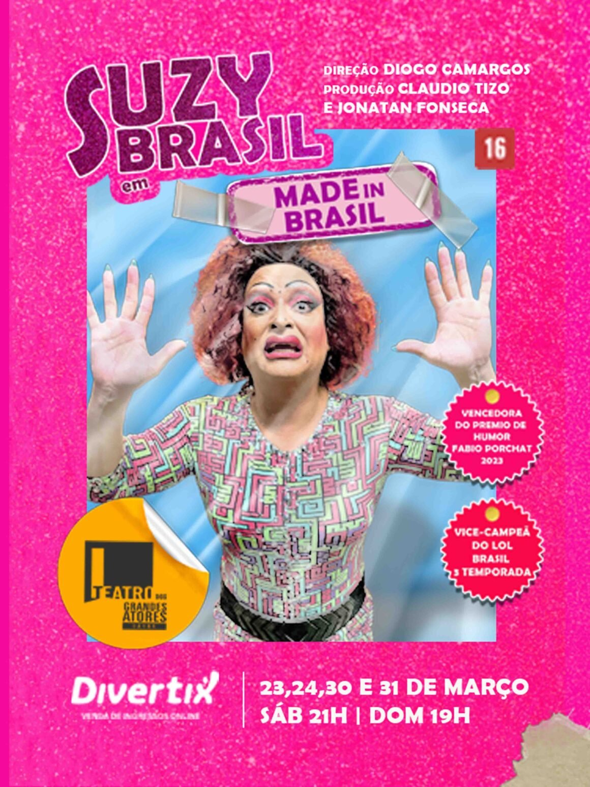 Vencedora do Prêmio Prio do Humor em 2023 pelo espetáculo “Bye Bye Bangu” e vice-campeã da terceira temporada do “Lol Brasil – Se Rir, Já Era” do Amazon Prime, Suzy Brasil estreia seu novo stand up comedy, “Made in Brasil”, no Teatro dos Grandes Atores, na Barra da Tijuca, nos dias 23, 24, 30 e 31 de março, sábado, às 21h, e domingo, às 19h. No show, Suzy relembra divertidas histórias dos seus mais de 25 anos de vida artística e mais de 40 anos de vida do seu criador, Marcelo Souza.