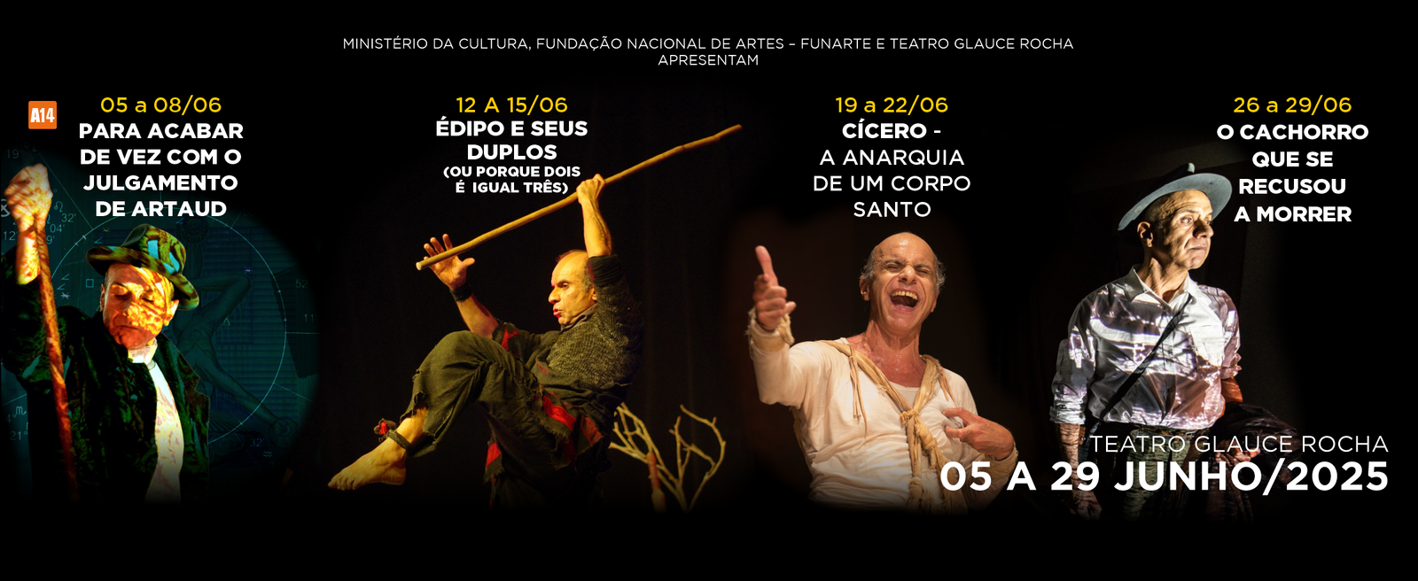Um panorama da produção teatral dos últimos 25 anos de carreira do premiado ator Samir Murad. Essa é a proposta da mostra “Teatro, Mito e Genealogia” da “Cia.Cambaleei, mas não caí…”, que acontece dentro do Programa Funarte Aberta. A mostra, que dá foco para quatro personagens míticos,ocupa no mês de junho o palco do Teatro Glauce Rocha, no centro do Rio, que pertence à Fundação Nacional das Artes – FUNARTE. Os quatro monólogos serão apresentados um a cada semana, de quintas a sábados (às 19h) e domingos (às 18h): “Para Acabar de Vez com o Julgamento de Artaud” (5 a 8/jun); “Édipo e Seus Duplos” (12 a 15/jun); “Cícero – a Anarquia de um Corpo Santo” (19 a 22/jun); e “O Cachorro que se Recusou a Morrer” (26 a 29/jun).